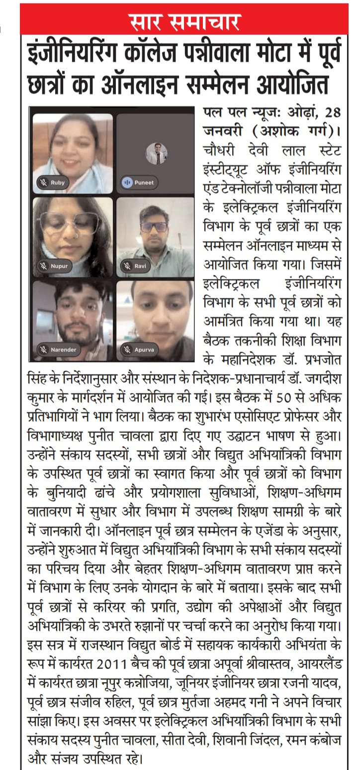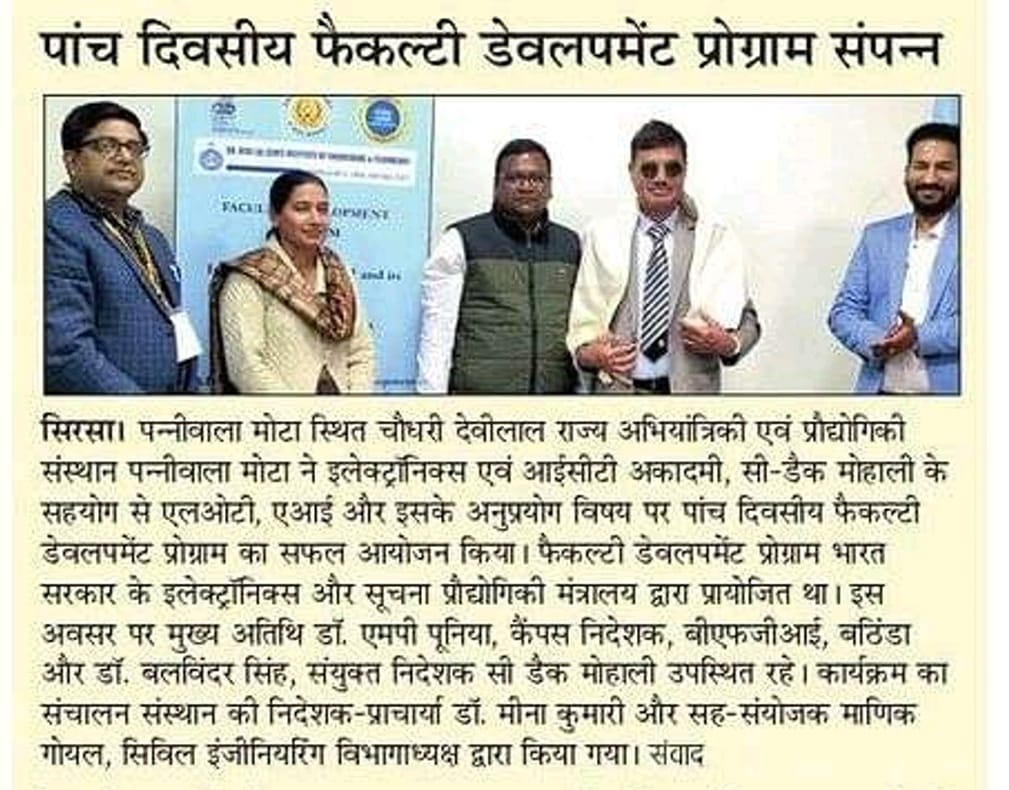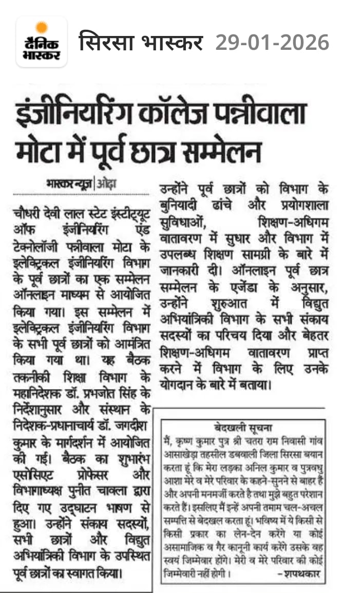 For the young generation and from a unique hardworking background, I am confident that Ch. Devi Lal State Institute of Engineering & Technology is a preferred destination for life-changing learning. We believe in excellence and exquisiteness. Competent faculty, innovative pedagogy backed by extensive practical exposures, regular seminars/workshops, personality development programmers, communication skill and interaction with industries are the key factors of our success.