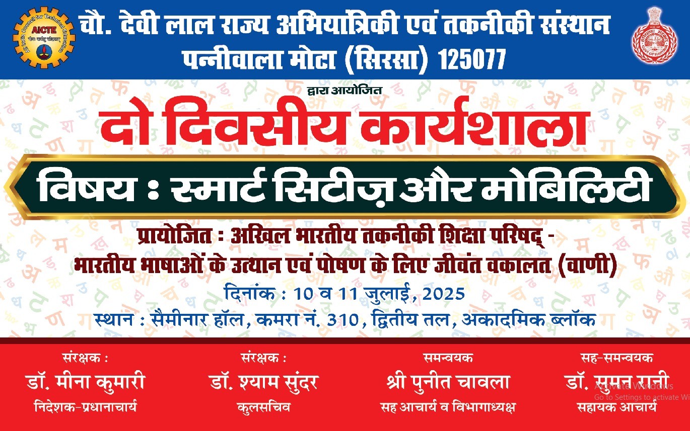 सेमिनार हॉल (कमरा नं. 310), दूसरी मंजिल अकादमिक ब्लॉक, चौ. देवी लाल राज्य इंजीनियरिंग एवं तकनीकी संस्थान, 22 किलोमीटर स्टोन, एनएच-9, सिरसा-डबवाली रोड, गांव पन्नीवाला मोटा, सिरसा, हरियाणा-125077 ।