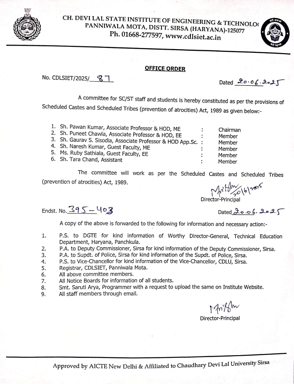 - P.S. to DGTE for kind information of Director-General, Technical Education Department, Haryana, Panchkula.