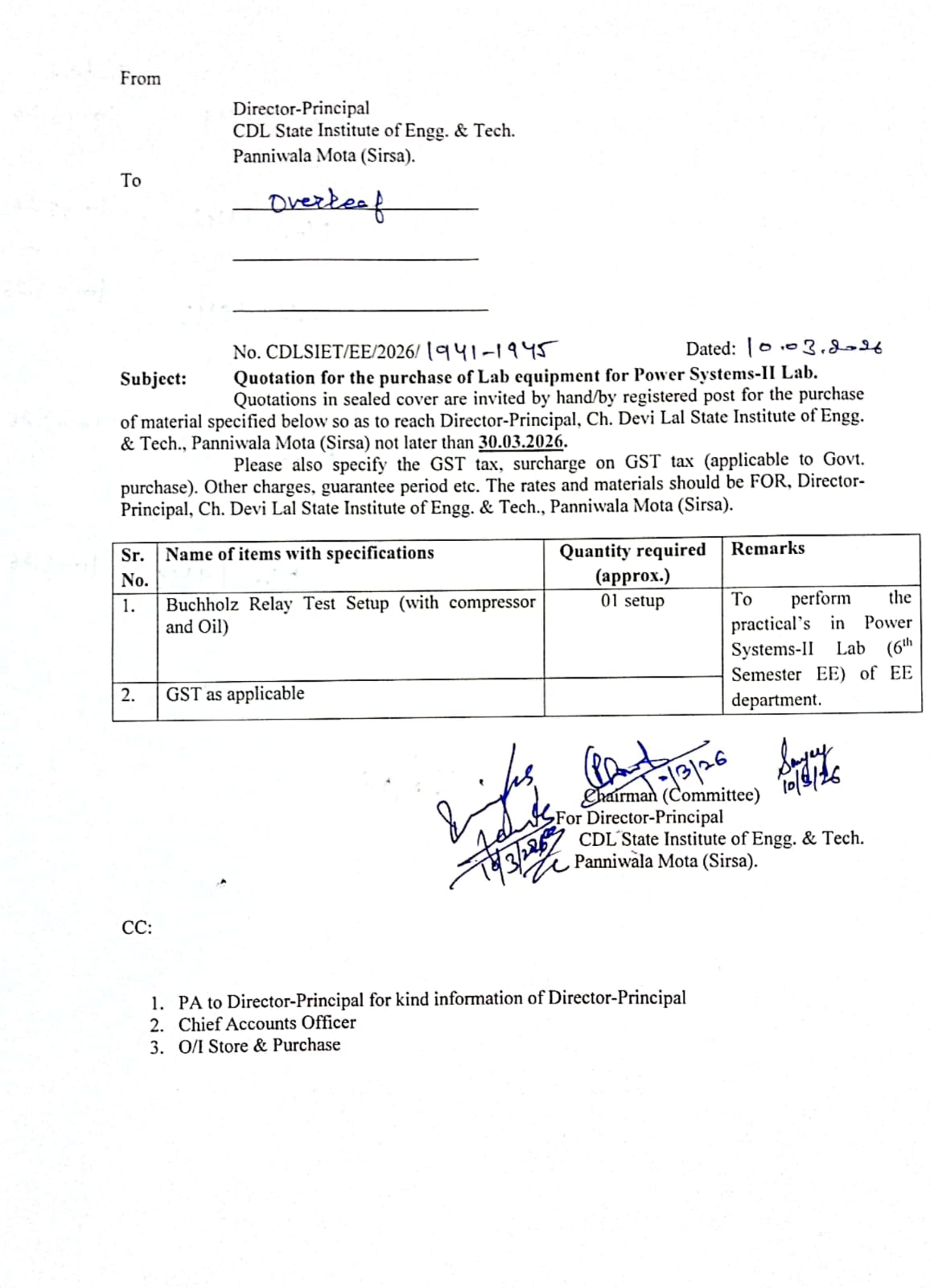 Tender for the Purchase of Kits/ Lab equipment for Power System- II 6th Semester EE