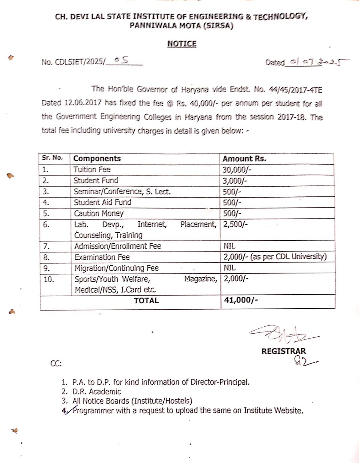 The Hon’ble Governor of-Haryana vide Endst. No. 44/45/2017-4TE Dated 12/06/17 has fixed the fee @ Rs.40,000/- per annum per student for all the Government Engineering colleges in Haryana from the session 2017-18. The total fee including university charges in detail is given below:-