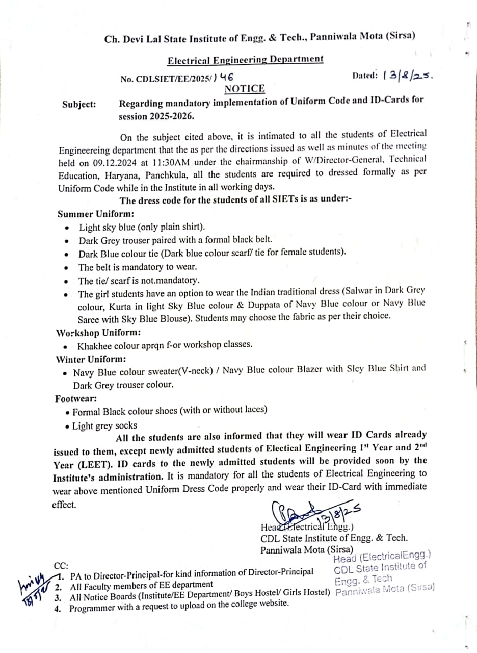 Notice Regarding mandatory implementation of Uniform Code and ID Cards for session 2025-26.