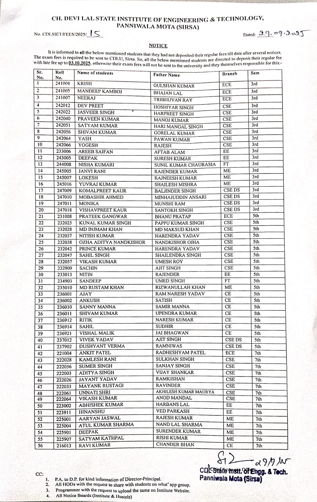Notice Regarding pending fees list students
